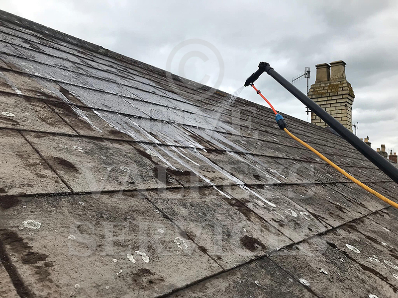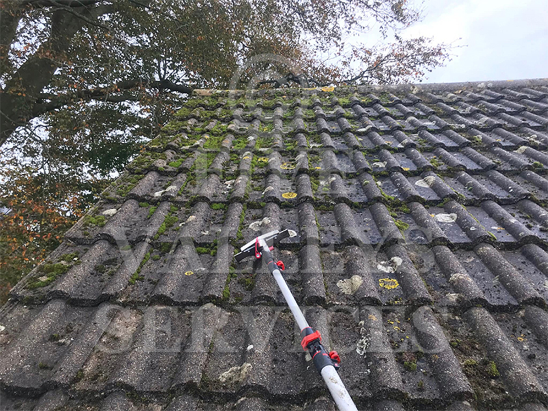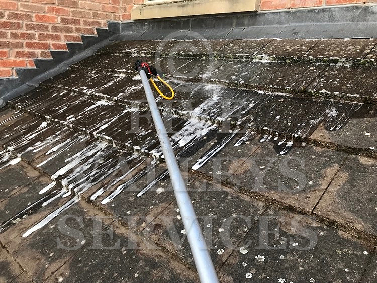 HSE-approved biodegradable biocide aka "softwash" being applied today following moss removal from this roof.