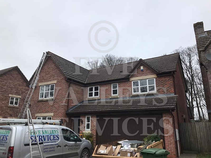 Recent roof moss removal & biocide softwash in Whiteshill. The softwash will kill any remaining moss & lichen over the coming months and will eventually bring the tiles back to their original colour.